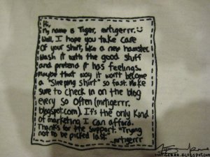 I have gotten to printing on my shirts now. It took me 25 tries before I got it this clear. It gave me a real big headache. It finally got easy after I tweaked it 25th times.These are going to be the tags for the back of my shirts. You can read it if you like. Hope you like it.